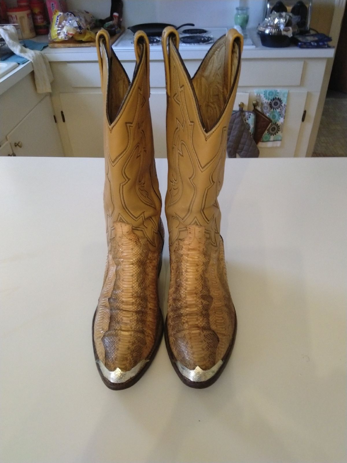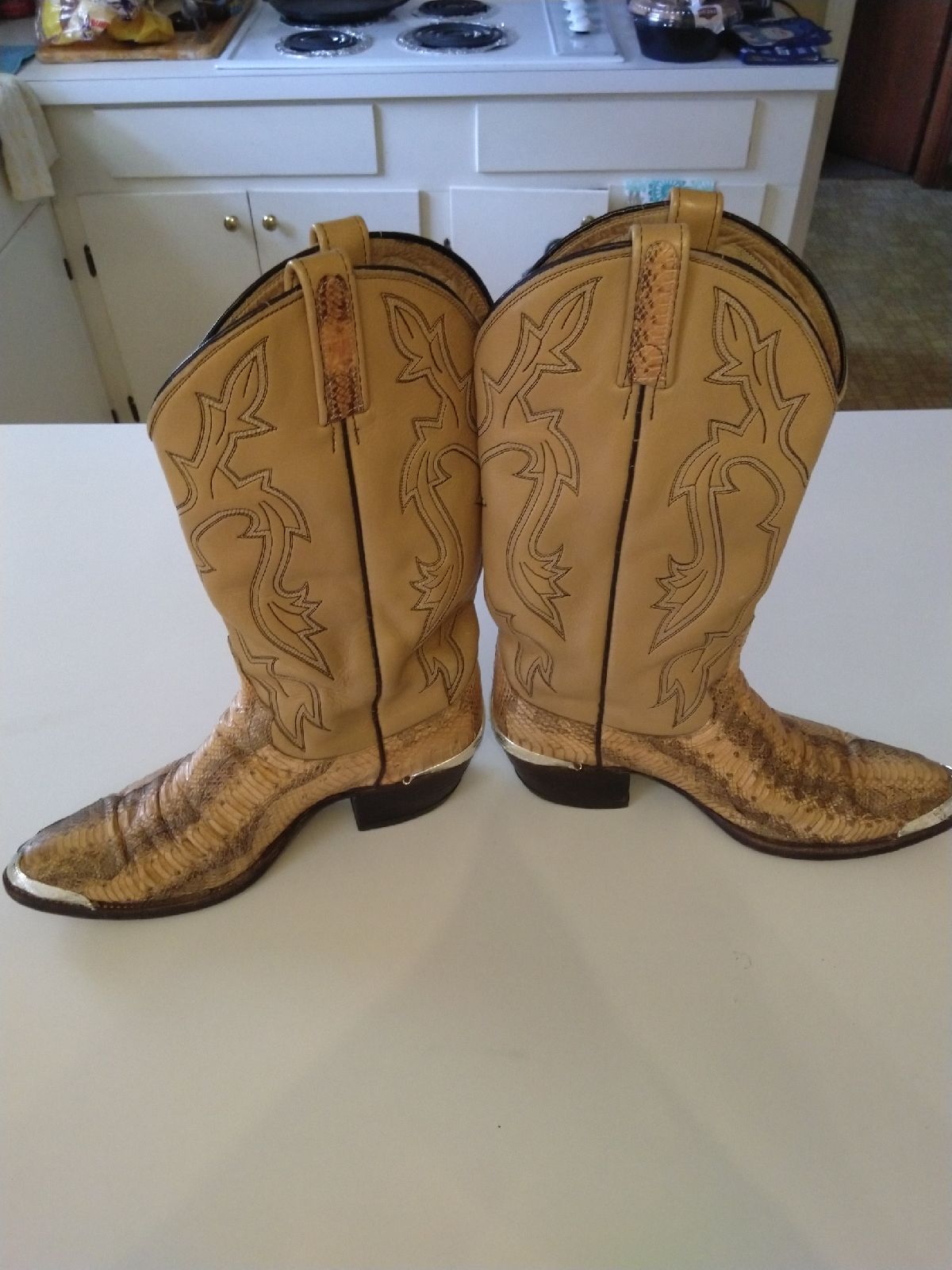 Vintage Snakeskin Cowboy boots in lovely palomino color with silver toe plates & heel guards .Real snakeskin foot & inserts on pull straps, real leather shaft . These Dan Post boots are quality made boots, they are 13 3/4" tall ,with 12" shaft ,heel is 1 3/4 " . Womens size 10 ,men's 9 D.